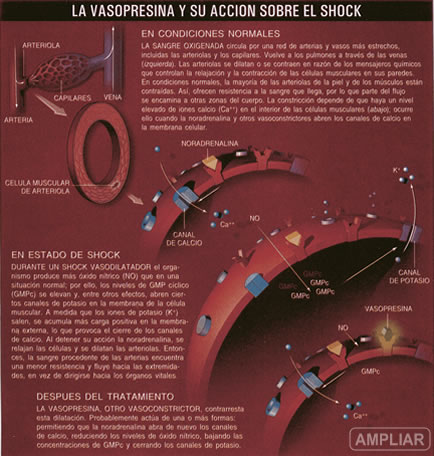 Nos inquietaba, de entrada, porqué los pacientes con shock vasodilatador sufrían tal deficiencia en vasopresina. En trabajos posteriores demostramos que, en el comienzo del shock -no importaba cuál fuera el desencadenante de éste-, los niveles de vasopresina se elevaban con desmesura. Pero al cabo de unas horas, la vasopresina caía. Ocurría que las reservas se liberaban en el comienzo del shock; la hormona se degradaba en el torrente circulatorio y los niveles de vasopresina tardaban en restablecerse. Reparamos entonces con sendos artículos, que habíamos dejado de lado porque todo el mundo habría concluido que la vasopresina no elevaba la presión arterial; en ellos se afirmaba que la vasopresina reducía los efectos dilatadores del óxido nítrico en las arteriolas y bloqueaba los canales de potasio sensibles al ATP, permitiendo la apertura de los canales de calcio y la contracción de la célula.