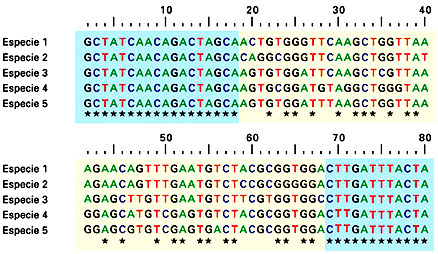 Comparación de secuencias de una misma región de ADN de 5 especies diferentes. Las regiones conservadas y variables están sombreadas en colores celeste y amarillo respectivamente. Los asteriscos identifican las columnas en las que no hay diferencia entre las especies.