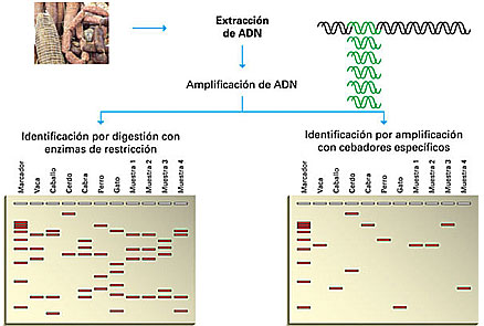 Identificación genética de los constituyentes de los alimentos. Los primeros pasos implican la extracción de ADN de las muestras y la amplificación de un segmento determinado por la técnica de PCR (en color verde). En la parte inferior del gráfico, a la izquierda, se muestra la separación, por medio de electroforesis, de los fragmentos de ADN resultantes de la digestión con enzimas de restricción de una región del ADN mitocondrial amplificado por PCR. A la derecha se muestra una electroforesis de fragmentos amplificados por PCR utilizando cebadores específicos para cada especie. Los últimos se diferencian por los distintos tamaños de las bandas amplificadas. En ambos paneles se muestran los patrones de bandas característicos de seis especies conocidas comparadas con los patrones de cuatro muestras de origen desconocido.