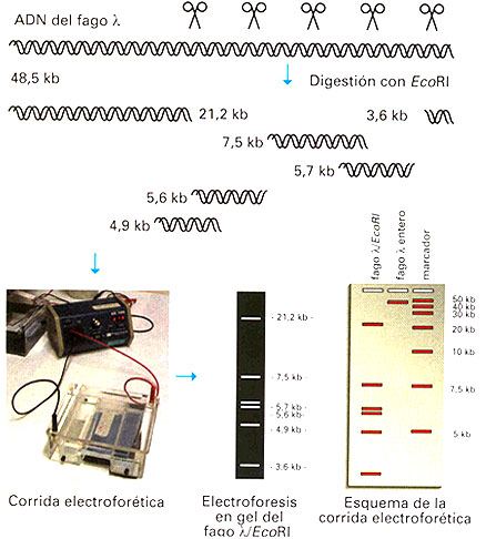 Debido a que las enzimas, de restricción digieren secuencias específicas de ADN, pueden ser utilizadas para cortar una molécula de este en sitios únicos. Por ejemplo, la enzima EcoRI reconoce la secuencia de seis pares de bases GAATTC, la que está presente cinco veces en el ADN de un virus bacteriano denominado bacteriófago ?. Así, dicha enzima digiere el ADN del virus (o fago) en seis fragmentos de entre 3600 y 21.200 pares de bases de longitud. Los fragmentos pueden separarse según su tamaño por medio de una electroforesis en gel, un método por el que se separan las moléculas basándose en su velocidad de migración en un campo eléctrico. El gel, habitualmente compuesto de agarosa o poliacrilamida, se sitúa entre dos compartimientos con electrodos en los que se dispone un tampón o buffer. La muestra (por ejemplo, una mezcla de fragmentos de ADN para ser analizados) se deposita en ranuras preformadas y se aplica el campo eléctrico. Los ácidos nucleicos tienen carga negativa, por lo que migran al electrodo positivo. El gel se comporta como un filtro poroso que retrasa la migración de los fragmentos más grandes. Las moléculas de menor tamaño se mueven a través del gel con mayor rapidez, lo que permite la separación de una mezcla de ácidos nucleicos en función de su tamaño.