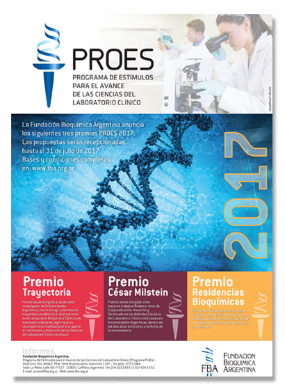 La Fundación Bioquímica Argentina anuncia los tres premios PROES 2017: Premio Trayectoria,-Premio César Milstein y Premio Residencias Bioquímicas. Las propuestas serán recepcionadas hasta el 31 de julio de 2017