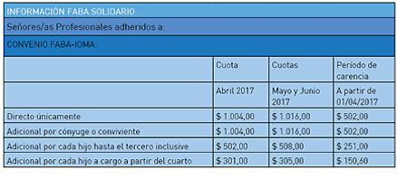 En este cuadro se encuentran disponibles los nuevos valores de las cuotas para los beneficiarios de FABA Salud - IOMA para los meses de abril, mayo y junio del corriente año. Así como el período de carencia a partir del 1º de abril de 2017.